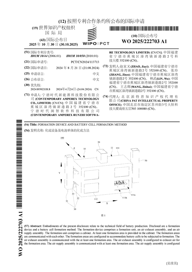 证券之星消息,根据企查查数据显示宁德时代(300750)公布了一项国际专利申请,专利名为“化成设备及电池单体的化成方法”,专利申请号为PCT/CN2024/113713,国际公布日为2025年10月30日。