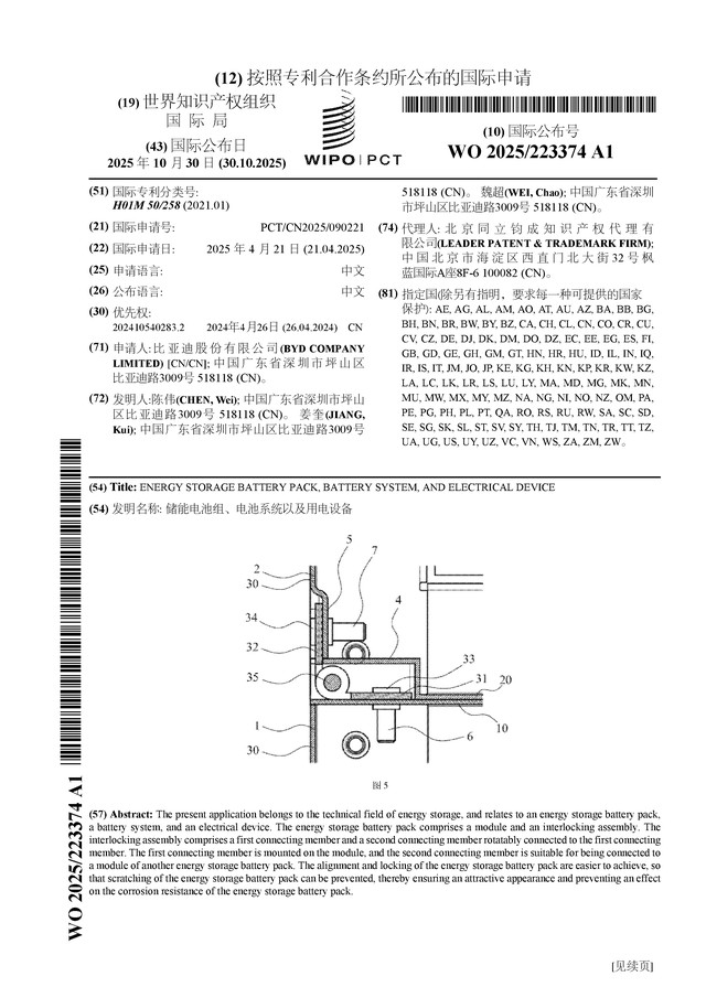 证券之星消息,根据企查查数据显示比亚迪(002594)公布了一项国际专利申请,专利名为“储能电池组、电池系统以及用电设备”,专利申请号为PCT/CN2025/090221,国际公布日为2025年10月30日。