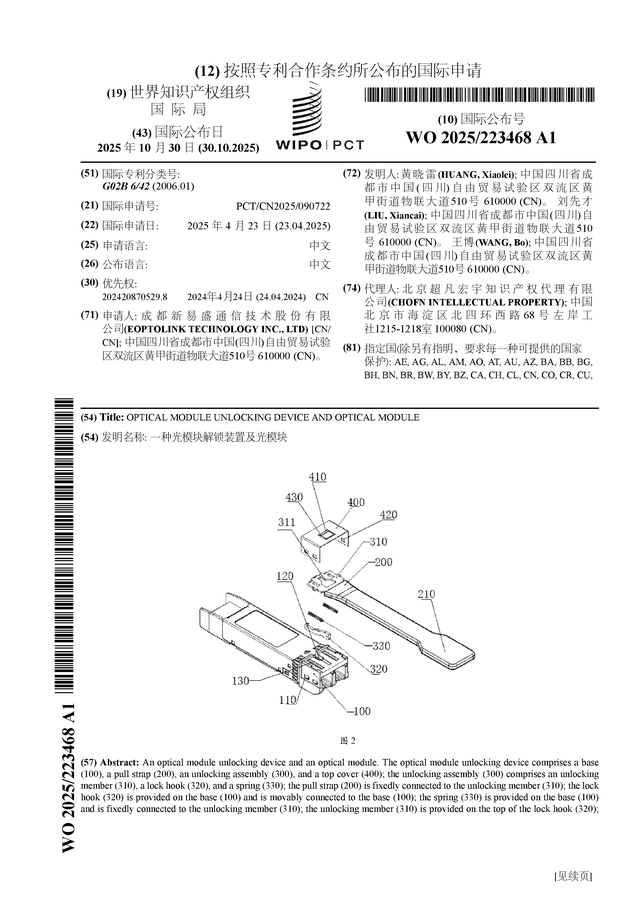 证券之星消息,根据企查查数据显示新易盛(300502)公布了一项国际专利申请,专利名为“一种光模块解锁装置及光模块”,专利申请号为PCT/CN2025/090722,国际公布日为2025年10月30日。