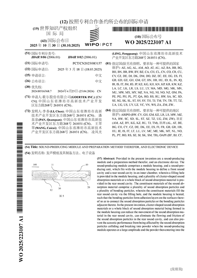 证券之星消息,根据企查查数据显示歌尔股份(002241)公布了一项国际专利申请,专利名为“发声模组及其制备方法、电子设备”,专利申请号为PCT/CN2025/083157,国际公布日为2025年10月30日。