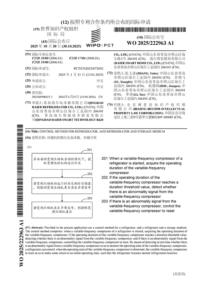 证券之星消息,根据企查查数据显示海尔智家(600690)公布了一项国际专利申请,专利名为“冰箱的控制方法及冰箱、存储介质”,专利申请号为PCT/CN2025/072052,国际公布日为2025年10月30日。