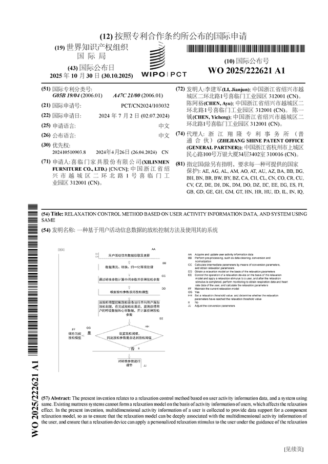 证券之星消息,根据企查查数据显示喜临门(603008)公布了一项国际专利申请,专利名为“一种基于用户活动信息数据的放松控制方法及使用其的系统”,专利申请号为PCT/CN2024/103032,国际公布日为2025年10月30日。