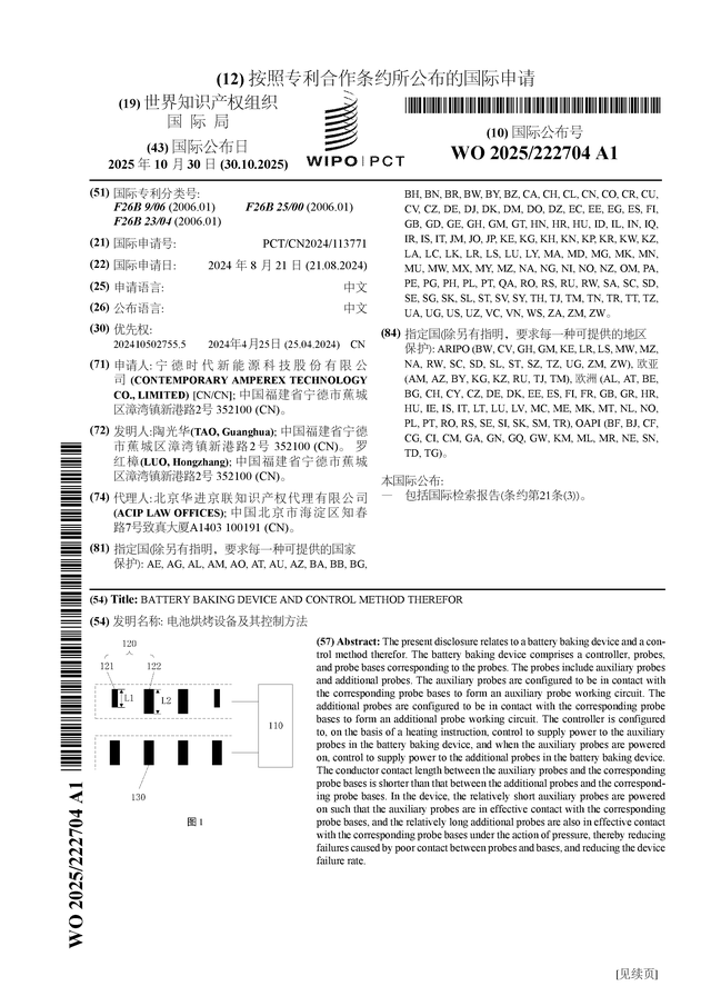 证券之星消息,根据企查查数据显示宁德时代(300750)公布了一项国际专利申请,专利名为“电池烘烤设备及其控制方法”,专利申请号为PCT/CN2024/113771,国际公布日为2025年10月30日。