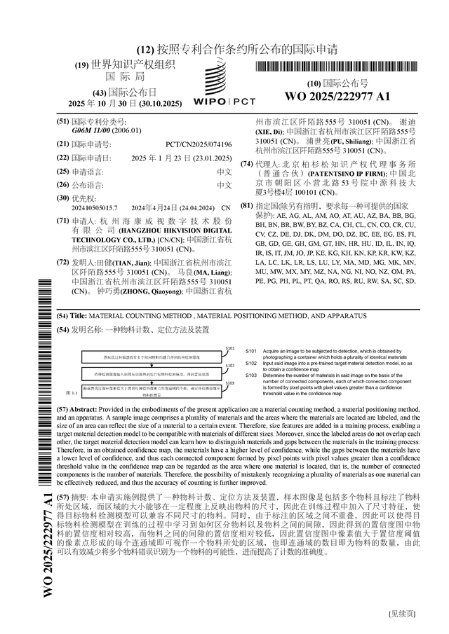 证券之星消息,根据企查查数据显示海康威视(002415)公布了一项国际专利申请,专利名为“一种物料计数、定位方法及装置”,专利申请号为PCT/CN2025/074196,国际公布日为2025年10月30日。