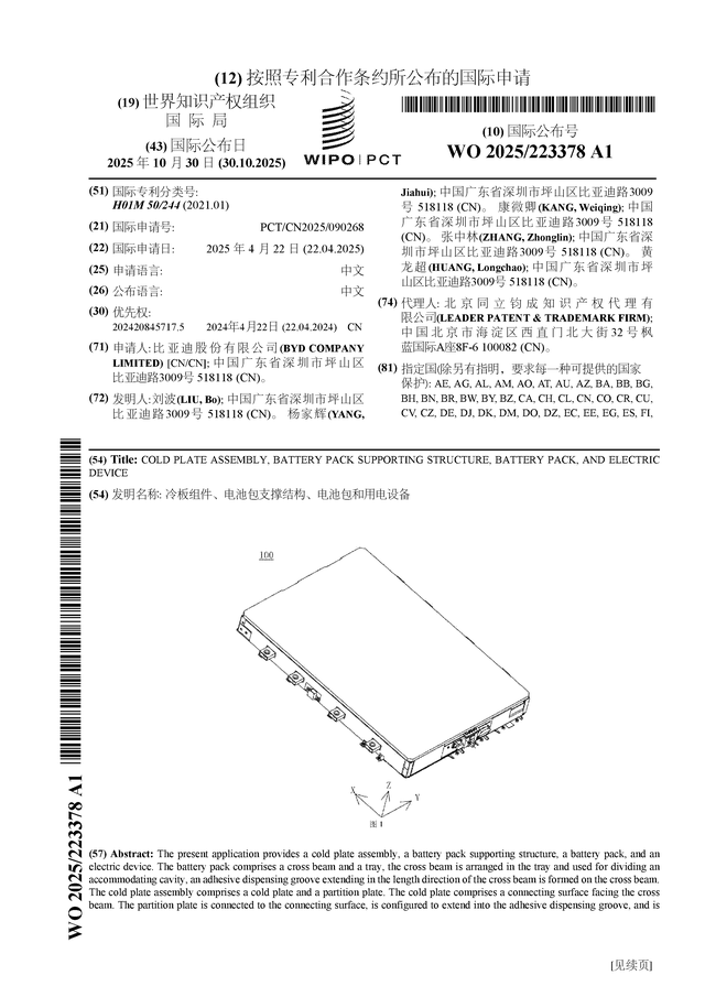 证券之星消息,根据企查查数据显示比亚迪(002594)公布了一项国际专利申请,专利名为“冷板组件、电池包支撑结构、电池包和用电设备”,专利申请号为PCT/CN2025/090268,国际公布日为2025年10月30日。