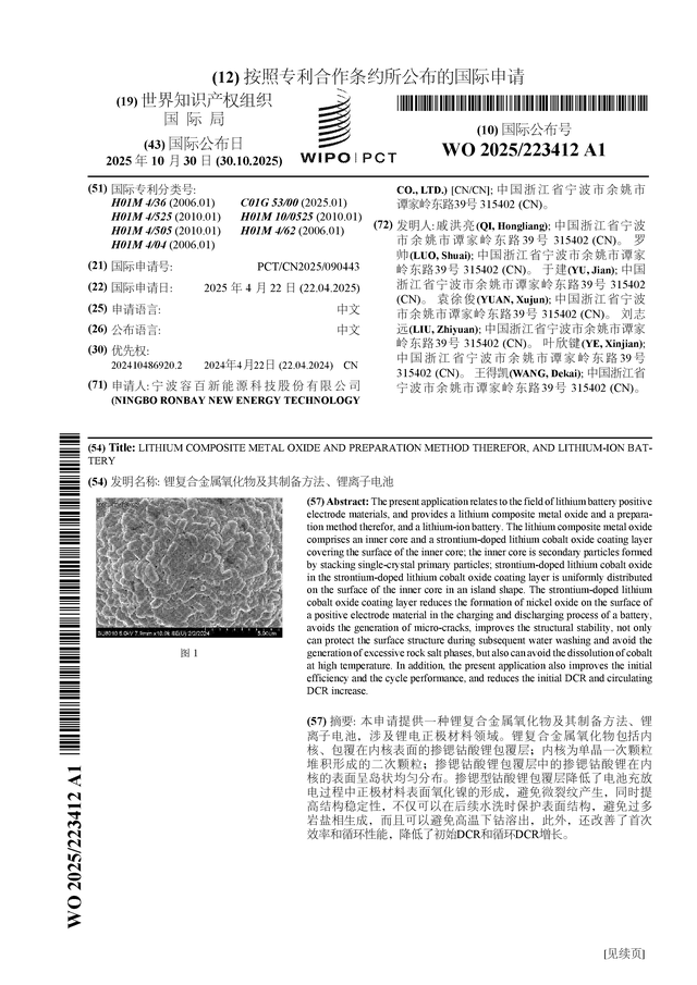 证券之星消息,根据企查查数据显示容百科技(688005)公布了一项国际专利申请,专利名为“锂复合金属氧化物及其制备方法、锂离子电池”,专利申请号为PCT/CN2025/090443,国际公布日为2025年10月30日。