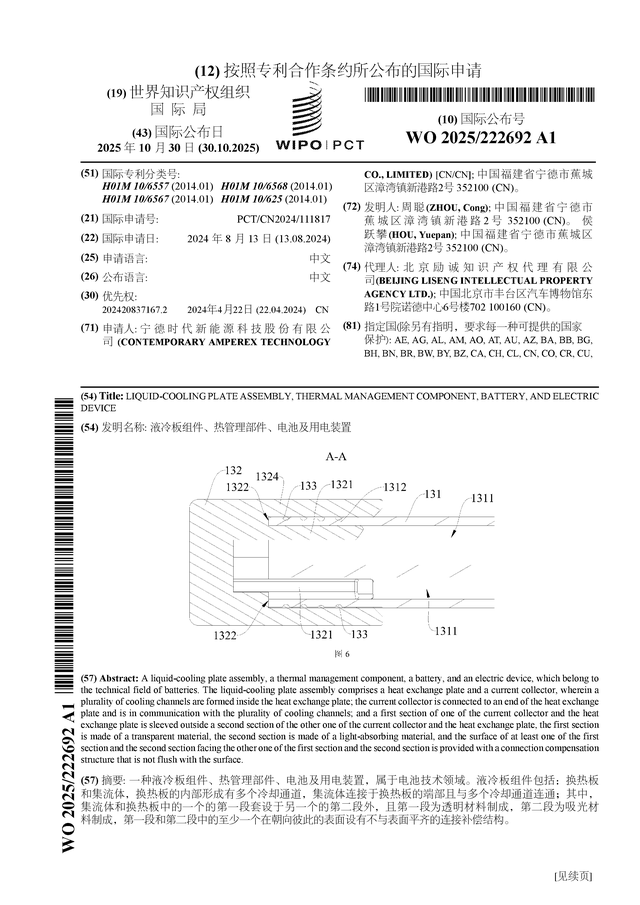 证券之星消息,根据企查查数据显示宁德时代(300750)公布了一项国际专利申请,专利名为“液冷板组件、热管理部件、电池及用电装置”,专利申请号为PCT/CN2024/111817,国际公布日为2025年10月30日。