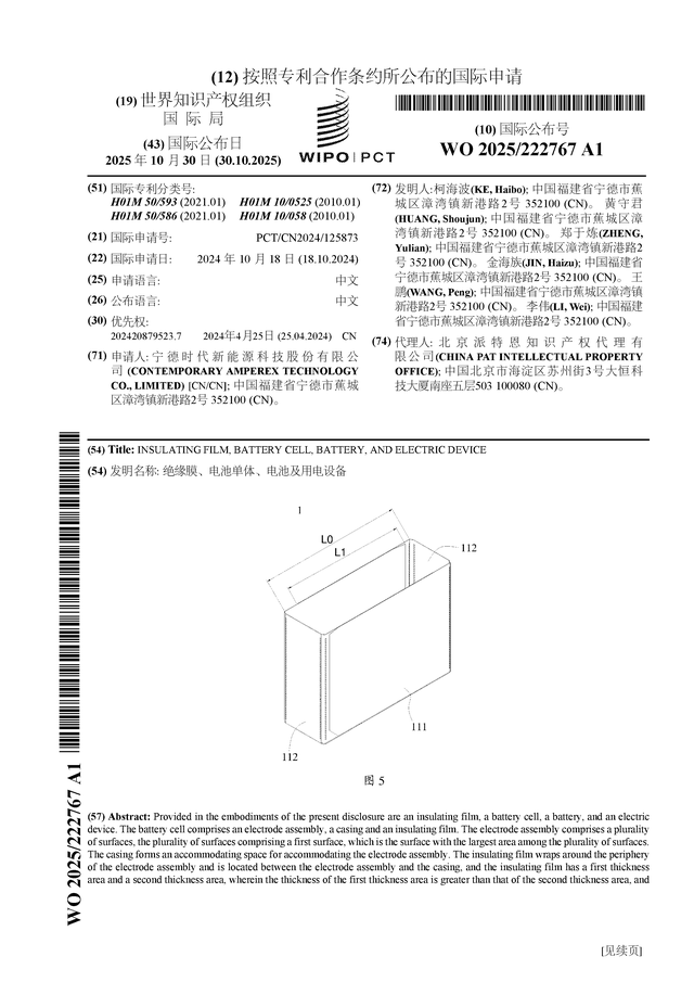 证券之星消息,根据企查查数据显示宁德时代(300750)公布了一项国际专利申请,专利名为“绝缘膜、电池单体、电池及用电设备”,专利申请号为PCT/CN2024/125873,国际公布日为2025年10月30日。