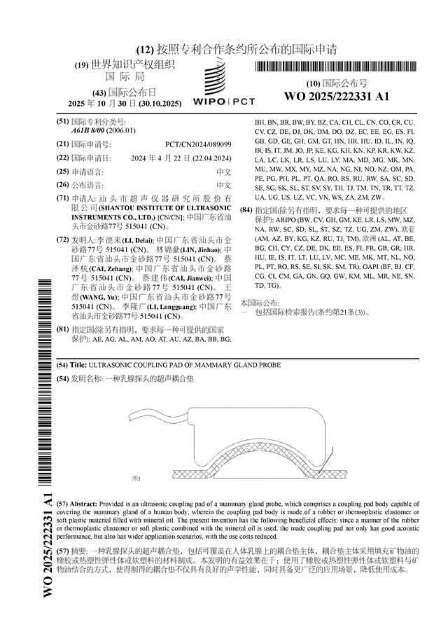 证券之星消息,根据企查查数据显示超研股份(301602)公布了一项国际专利申请,专利名为“一种乳腺探头的超声耦合垫”,专利申请号为PCT/CN2024/089099,国际公布日为2025年10月30日。
