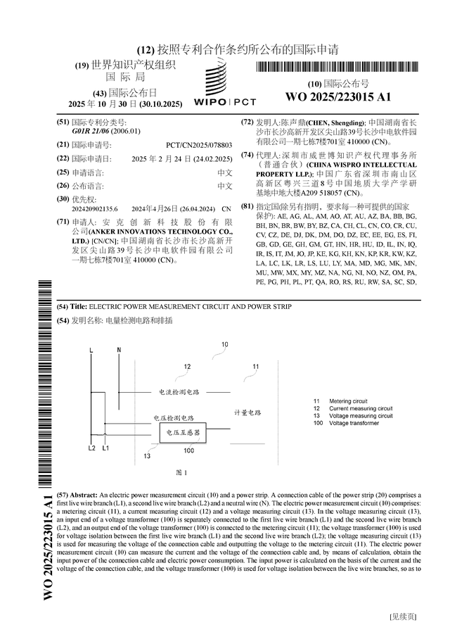 证券之星消息,根据企查查数据显示安克创新(300866)公布了一项国际专利申请,专利名为“电量检测电路和排插”,专利申请号为PCT/CN2025/078803,国际公布日为2025年10月30日。