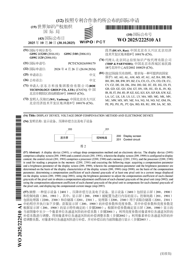 证券之星消息,根据企查查数据显示京东方A(000725)公布了一项国际专利申请,专利名为“显示设备、压降补偿方法及电子设备”,专利申请号为PCT/CN2024/090179,国际公布日为2025年10月30日。