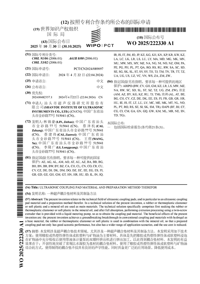 证券之星消息,根据企查查数据显示超研股份(301602)公布了一项国际专利申请,专利名为“一种超声耦合垫材料及其制备方法”,专利申请号为PCT/CN2024/089097,国际公布日为2025年10月30日。