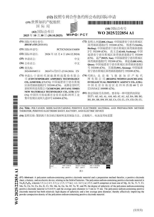证券之星消息,根据企查查数据显示宁德时代(300750)公布了一项国际专利申请,专利名为“聚阴离子类含钠正极材料及其制备方法、正极极片、电池及用电装置”,专利申请号为PCT/CN2024/136850,国际公布日为2025年10月30日。