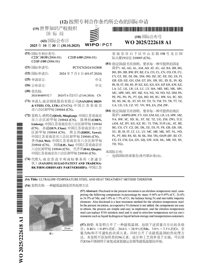 证券之星消息,根据企查查数据显示南钢股份(600282)公布了一项国际专利申请,专利名为“一种超低温钢及其热处理方法”,专利申请号为PCT/CN2024/102808,国际公布日为2025年10月30日。