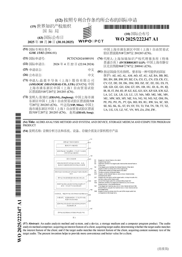 证券之星消息,根据企查查数据显示晶晨股份(688099)公布了一项国际专利申请,专利名为“音频分析方法和系统、设备、存储介质及计算机程序产品”,专利申请号为PCT/CN2024/089191,国际公布日为2025年10月30日。