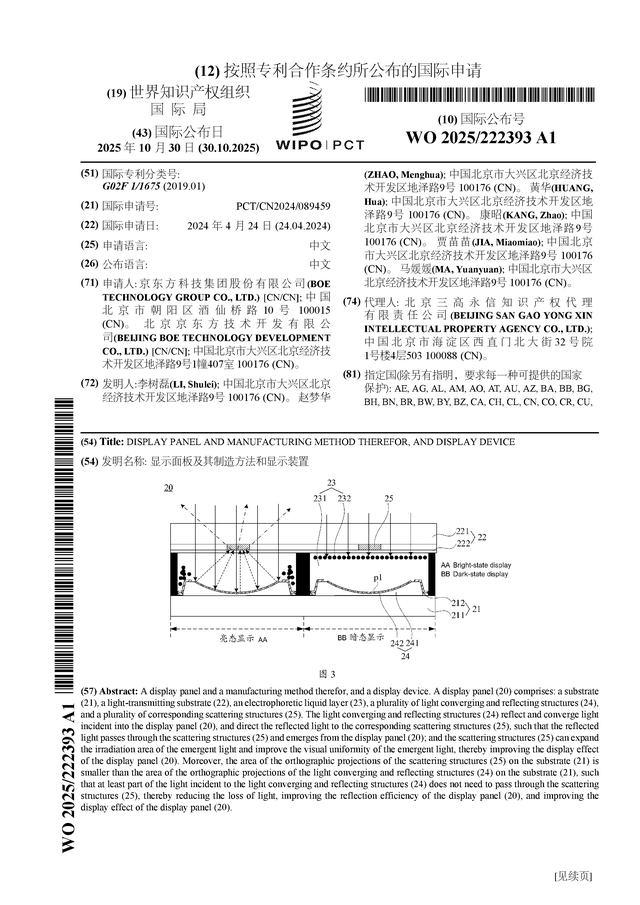 证券之星消息,根据企查查数据显示京东方A(000725)公布了一项国际专利申请,专利名为“显示面板及其制造方法和显示装置”,专利申请号为PCT/CN2024/089459,国际公布日为2025年10月30日。