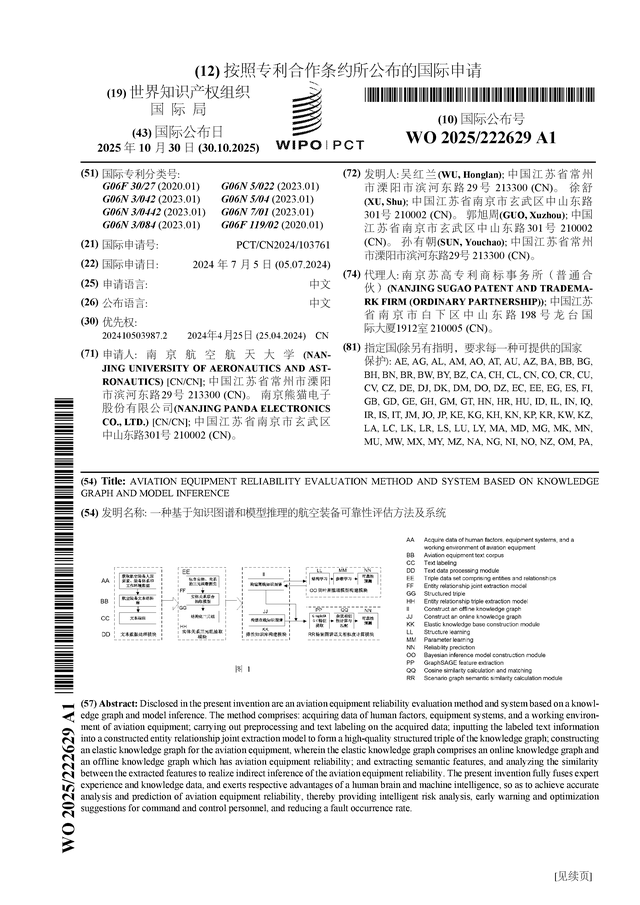 证券之星消息,根据企查查数据显示南京熊猫(600775)公布了一项国际专利申请,专利名为“一种基于知识图谱和模型推理的航空装备可靠性评估方法及系统”,专利申请号为PCT/CN2024/103761,国际公布日为2025年10月30日。