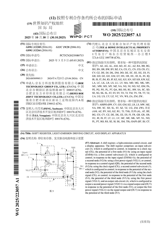 证券之星消息,根据企查查数据显示京东方A(000725)公布了一项国际专利申请,专利名为“移位寄存器、发光驱动电路和显示装置”,专利申请号为PCT/CN2025/080713,国际公布日为2025年10月30日。