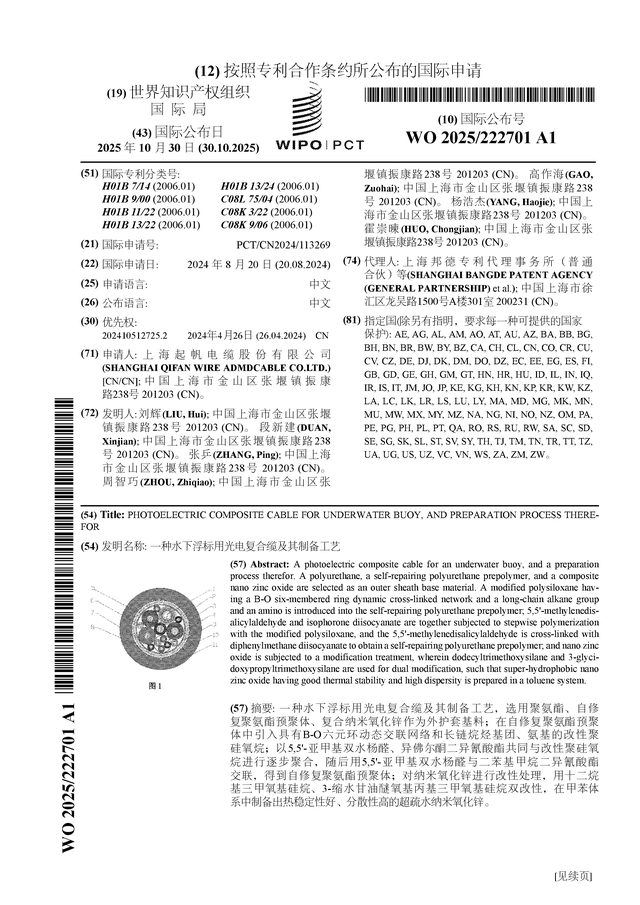 证券之星消息,根据企查查数据显示起帆电缆(605222)公布了一项国际专利申请,专利名为“一种水下浮标用光电复合缆及其制备工艺”,专利申请号为PCT/CN2024/113269,国际公布日为2025年10月30日。
