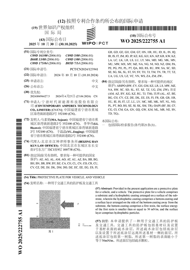 证券之星消息,根据企查查数据显示宁德时代(300750)公布了一项国际专利申请,专利名为“一种用于交通工具的防护板及交通工具”,专利申请号为PCT/CN2024/123941,国际公布日为2025年10月30日。