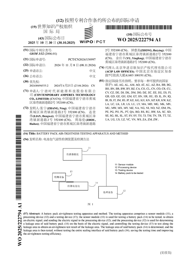 证券之星消息,根据企查查数据显示宁德时代(300750)公布了一项国际专利申请,专利名为“电池包气密性检测装置及检测方法”,专利申请号为PCT/CN2024/130997,国际公布日为2025年10月30日。