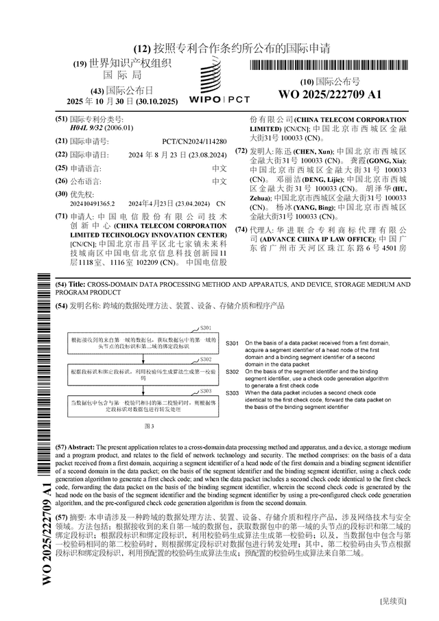 证券之星消息,根据企查查数据显示中国电信(601728)公布了一项国际专利申请,专利名为“跨域的数据处理方法、装置、设备、存储介质和程序产品”,专利申请号为PCT/CN2024/114280,国际公布日为2025年10月30日。