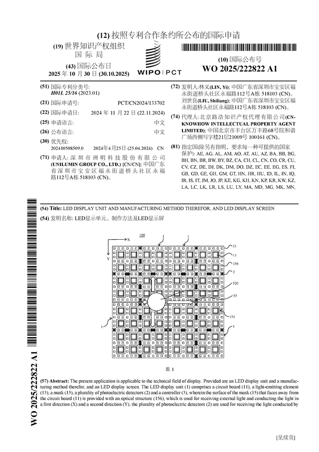 证券之星消息,根据企查查数据显示洲明科技(300232)公布了一项国际专利申请,专利名为“LED显示单元、制作方法及LED显示屏”,专利申请号为PCT/CN2024/133702,国际公布日为2025年10月30日。