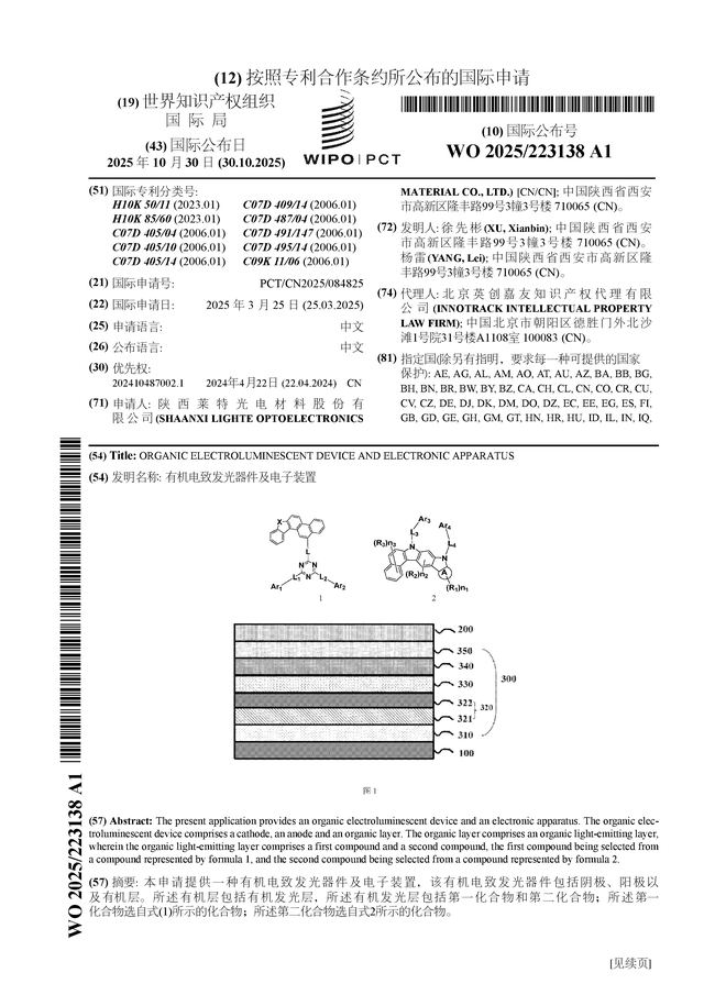 证券之星消息,根据企查查数据显示莱特光电(688150)公布了一项国际专利申请,专利名为“有机电致发光器件及电子装置”,专利申请号为PCT/CN2025/084825,国际公布日为2025年10月30日。