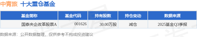 持有中青旅最多的基金为国泰央企改革股票A,目前规模为0.59亿元,最新净值1.7705(10月30日),较上一交易日下跌0.56%,近一年上涨7.87%。该基金现任基金经理为张容赫。