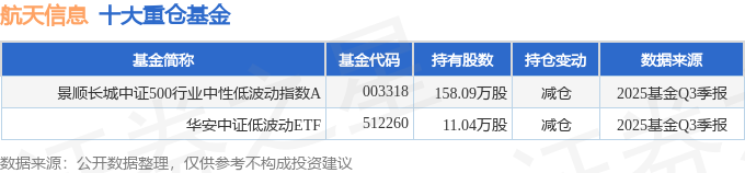 持有航天信息最多的基金为景顺长城中证500行业中性低波动指数A,目前规模为7.78亿元,最新净值1.6755(10月30日),较上一交易日下跌1.18%,近一年上涨18.89%。该基金现任基金经理为曾理。