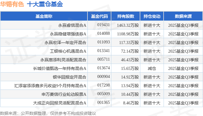 持有华锡有色最多的基金为永赢睿信混合A,目前规模为40.9亿元,最新净值2.0827(10月31日),较上一交易日下跌2.81%,近一年上涨79.23%。该基金现任基金经理为高楠。