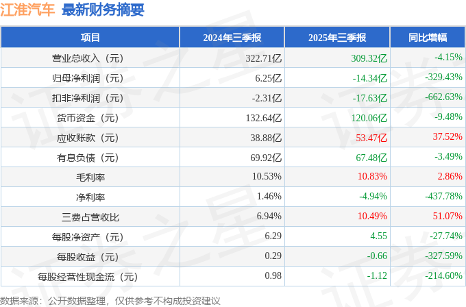 据证券之星公开数据整理,近期江淮汽车(600418)发布2025年三季报。截至本报告期末,公司营业总收入309.32亿元,同比下降4.15%,归母净利润-14.34亿元,同比下降329.43%。按单季度数据看,第三季度营业总收入115.34亿元,同比上升5.52%,第三季度归母净利润-6.61亿元,同比下降303.95%。本报告期江淮汽车三费占比上升明显,财务费用、销售费用和管理费用总和占总营收同比增幅达35.57%。