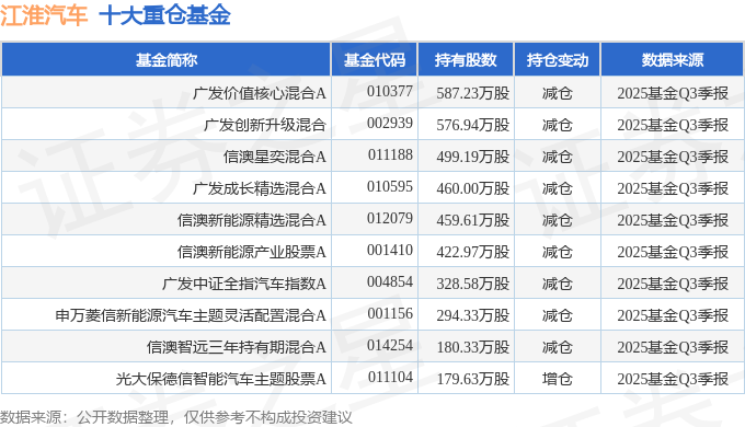 持有江淮汽车最多的基金为广发价值核心混合A,目前规模为40.9亿元,最新净值0.9454(10月31日),较上一交易日下跌0.94%,近一年上涨57.1%。该基金现任基金经理为吴远怡。
