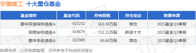 持有安徽建工最多的基金为鹏华双债保利债券A,目前规模为1.97亿元,最新净值1.1047(10月31日),较上一交易日下跌0.05%,近一年上涨8.01%。该基金现任基金经理为祝松 吴国杰。