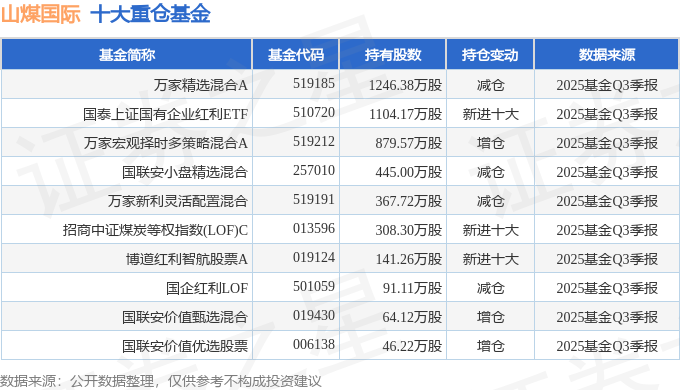 持有山煤国际最多的基金为万家精选混合A,目前规模为10.85亿元,最新净值1.8139(10月31日),较上一交易日下跌0.52%,近一年上涨1.1%。该基金现任基金经理为黄海。