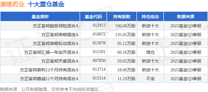 持有康缘药业最多的基金为方正富邦趋势领航混合A,目前规模为5.11亿元,最新净值0.8957(10月31日),较上一交易日上涨0.44%,近一年上涨10.25%。该基金现任基金经理为崔建波。