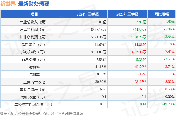 据证券之星公开数据整理,近期新世界(600628)发布2025年三季报。截至本报告期末,公司营业总收入7.91亿元,同比下降1.9%,归母净利润6447.9万元,同比下降1.46%。按单季度数据看,第三季度营业总收入2.63亿元,同比下降1.13%,第三季度归母净利润1900.96万元,同比上升0.6%。本报告期新世界盈利能力上升,毛利率同比增幅3.71%,净利率同比增幅1.14%。