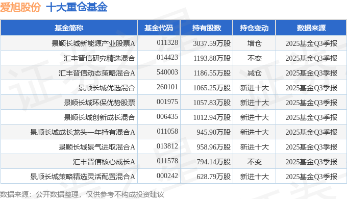 持有爱旭股份最多的基金为景顺长城新能源产业股票A,目前规模为24.68亿元,最新净值1.4866(10月30日),较上一交易日下跌0.75%,近一年上涨38.28%。该基金现任基金经理为杨锐文 曾英捷。
