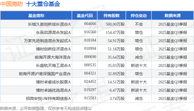 持有中国海防最多的基金为长城久嘉创新成长混合A,目前规模为19.74亿元,最新净值2.1983(10月30日),较上一交易日下跌0.61%,近一年上涨29.83%。该基金现任基金经理为尤国梁。