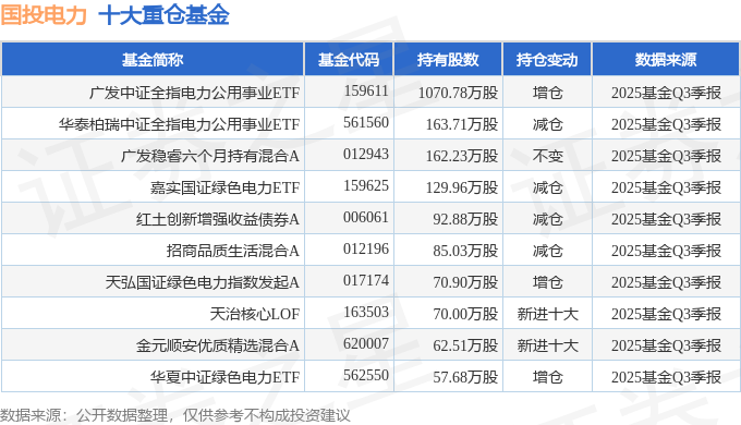 持有国投电力最多的基金为广发中证全指电力公用事业ETF,目前规模为36.27亿元,最新净值1.0627(10月31日),较上一交易日下跌1.94%,近一年上涨8.87%。该基金现任基金经理为陆志明。