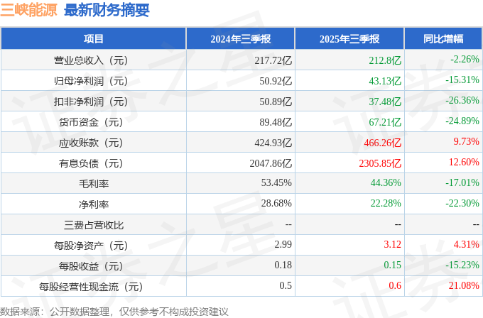 据证券之星公开数据整理,近期三峡能源(600905)发布2025年三季报。截至本报告期末,公司营业总收入212.8亿元,同比下降2.26%,归母净利润43.13亿元,同比下降15.31%。按单季度数据看,第三季度营业总收入65.45亿元,同比下降2.4%,第三季度归母净利润4.98亿元,同比下降52.87%。本报告期三峡能源公司应收账款体量较大,当期应收账款占最新年报归母净利润比达762.94%。