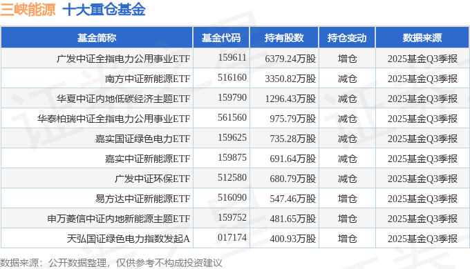 持有三峡能源最多的基金为广发中证全指电力公用事业ETF,目前规模为36.27亿元,最新净值1.0627(10月31日),较上一交易日下跌1.94%,近一年上涨8.87%。该基金现任基金经理为陆志明。