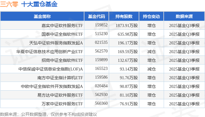 持有三六零最多的基金为嘉实中证软件服务ETF,目前规模为50.25亿元,最新净值0.9395(10月31日),较上一交易日上涨2.18%,近一年上涨19.12%。该基金现任基金经理为田光远。