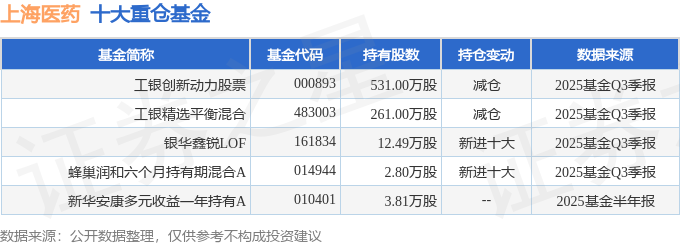 持有上海医药最多的基金为工银创新动力股票,目前规模为23.85亿元,最新净值1.27(10月31日),较上一交易日下跌0.7%,近一年上涨10.35%。该基金现任基金经理为杨鑫鑫。