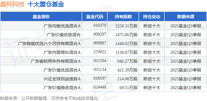 持有晶科科技最多的基金为广发均衡优选混合A,目前规模为22.82亿元,最新净值0.9109(10月31日),较上一交易日上涨0.25%,近一年下跌12.83%。该基金现任基金经理为王明旭。
