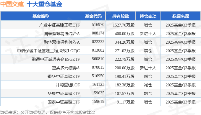 持有中国交建最多的基金为广发中证基建工程ETF,目前规模为26.12亿元,最新净值1.1988(10月31日),较上一交易日下跌1.54%,近一年上涨7.49%。该基金现任基金经理为霍华明。