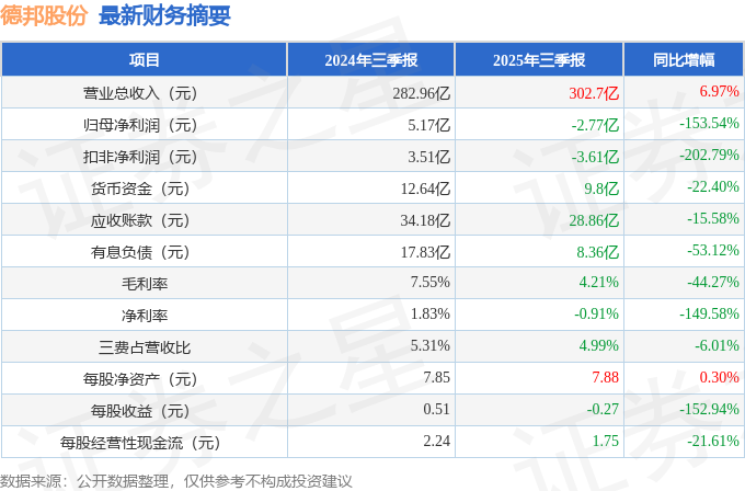据证券之星公开数据整理,近期德邦股份(603056)发布2025年三季报。截至本报告期末,公司营业总收入302.7亿元,同比上升6.97%,归母净利润-2.77亿元,同比下降153.54%。按单季度数据看,第三季度营业总收入97.15亿元,同比下降1.37%,第三季度归母净利润-3.29亿元,同比下降278.64%。本报告期德邦股份公司应收账款体量较大,当期应收账款占最新年报归母净利润比达335.3%。