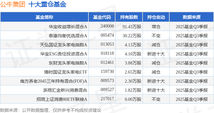 持有公牛集团最多的基金为华宝收益增长混合A,目前规模为7.1亿元,最新净值8.6263(10月31日),较上一交易日下跌0.55%,近一年上涨14.46%。该基金现任基金经理为毛文博。