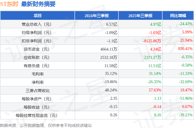 据证券之星公开数据整理,近期ST东时(603377)发布2025年三季报。截至本报告期末,公司营业总收入4.97亿元,同比下降24.43%,归母净利润-1.03亿元,同比上升5.99%。按单季度数据看,第三季度营业总收入2.0亿元,同比下降11.68%,第三季度归母净利润396.38万元,同比上升110.78%。本报告期ST东时短期债务压力上升,流动比率达0.28。