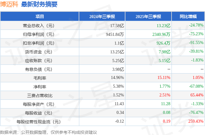 据证券之星公开数据整理,近期博迈科(603727)发布2025年三季报。截至本报告期末,公司营业总收入13.23亿元,同比下降24.78%,归母净利润2340.96万元,同比下降75.23%。按单季度数据看,第三季度营业总收入2.8亿元,同比下降59.91%,第三季度归母净利润1102.38万元,同比下降64.75%。本报告期博迈科公司应收账款体量较大,当期应收账款占最新年报归母净利润比达512.57%。
